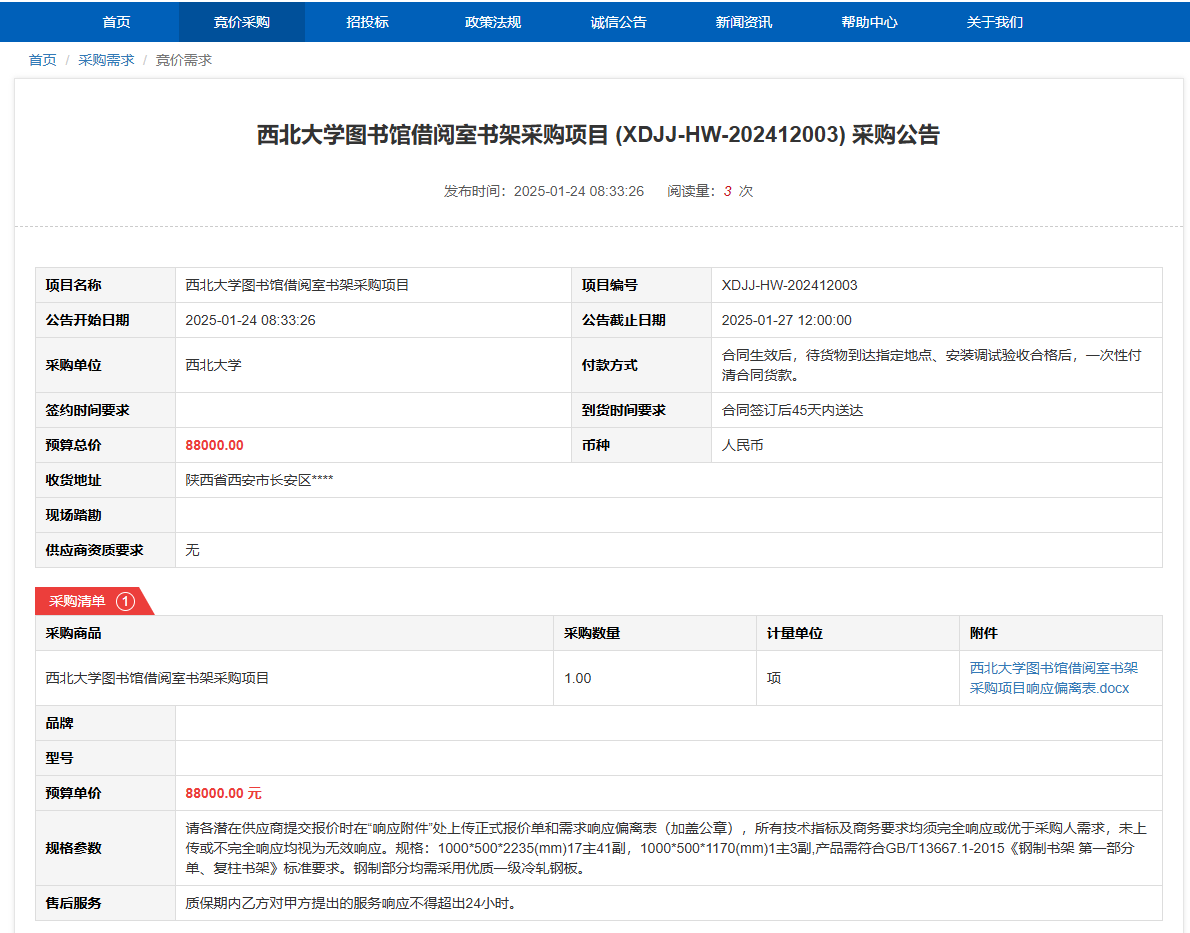 广发体育图书馆借阅室书架采购项目 (XDJJ-HW-202412003) 采购公告 作者:采购与招标办公室 编辑: 时间:2025-01-24 原公告链接:https://www.ejingcai.com.cn/site/bidding/detail/16453