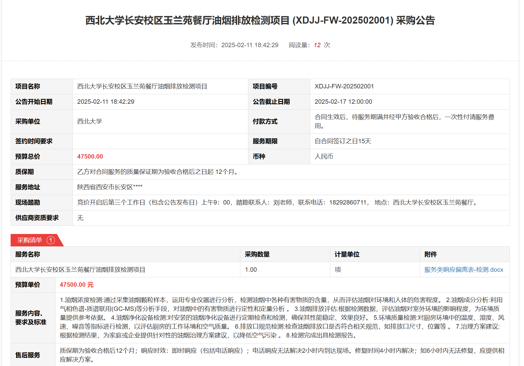广发体育长安校区玉兰苑餐厅油烟排放检测项目(XDJJ-FW-202502001)竞价采购公告 作者:采购与招标办公室 编辑: 时间:2025-02-11 原公告链接:https://www.ejingcai.com.cn/site/bidding/detail/16498