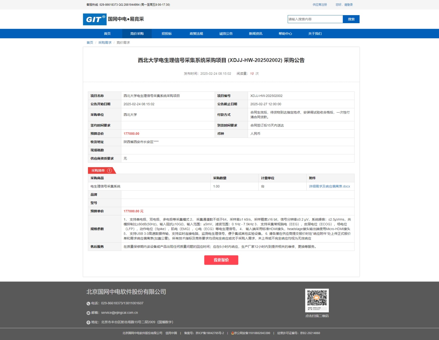 广发体育电生理信号采集系统采购项目 (XDJJ-HW-202502002) 竞价采购公告 作者: 编辑:采购与招标办公室 时间:2025-02-24 原公告链接:https://www.ejingcai.com.cn/site/bidding/detail/16589