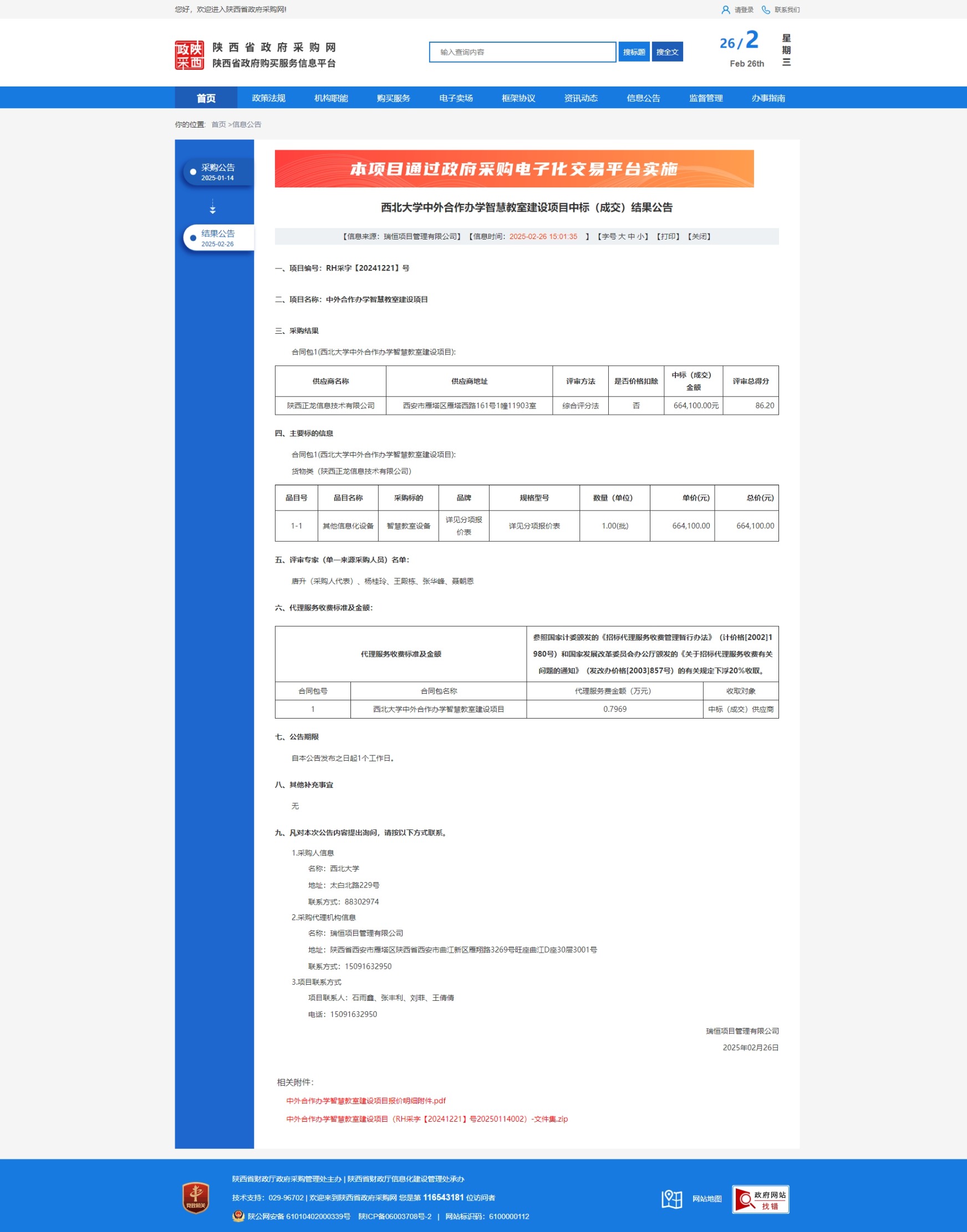 广发体育中外合作办学智慧教室建设项目中标(成交)结果公告 作者: 编辑:采购与招标办公室 时间:2025-02-26 原公告链接:https://www.ccgp-shaanxi.gov.cn/freecms/site/shaanxi/ggxx/info/2025/8a69c07394fffbb3019540f217e8256e.html?noticeType=001021¬iceId=47d2d283-f411-11ef-8063-08c0eb20c666