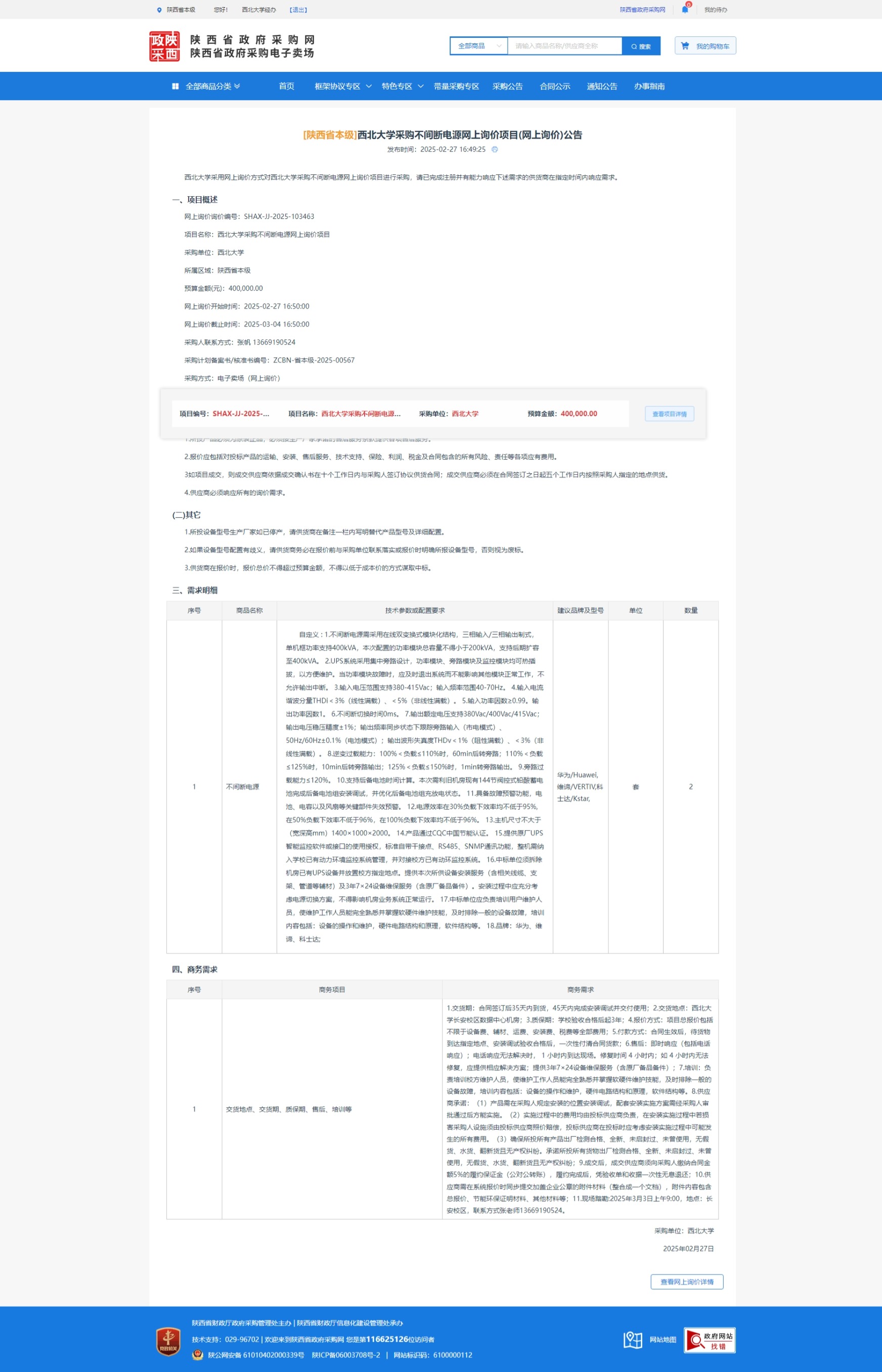 广发体育采购不间断电源网上询价项目(网上询价)公告 作者: 编辑: 时间:2025-02-27 原公告链接:https://www.ccgp-shaanxi.gov.cn/gpmall-main-web/basic/noticeDetail?noticeGuid=7294181247151177728