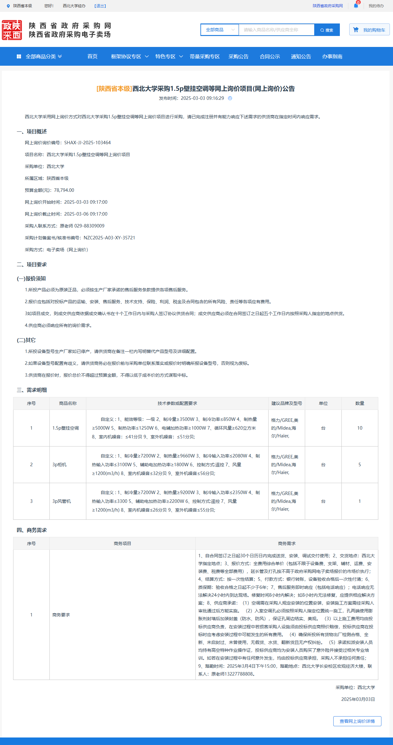广发体育采购1.5p壁挂空调等网上询价项目(网上询价)公告 作者:采购与招标办公室 编辑: 时间:2025-03-03 原公告链接:https://www.ccgp-shaanxi.gov.cn/gpmall-main-web/basic/noticeDetail?noticeGuid=7295516810999431168