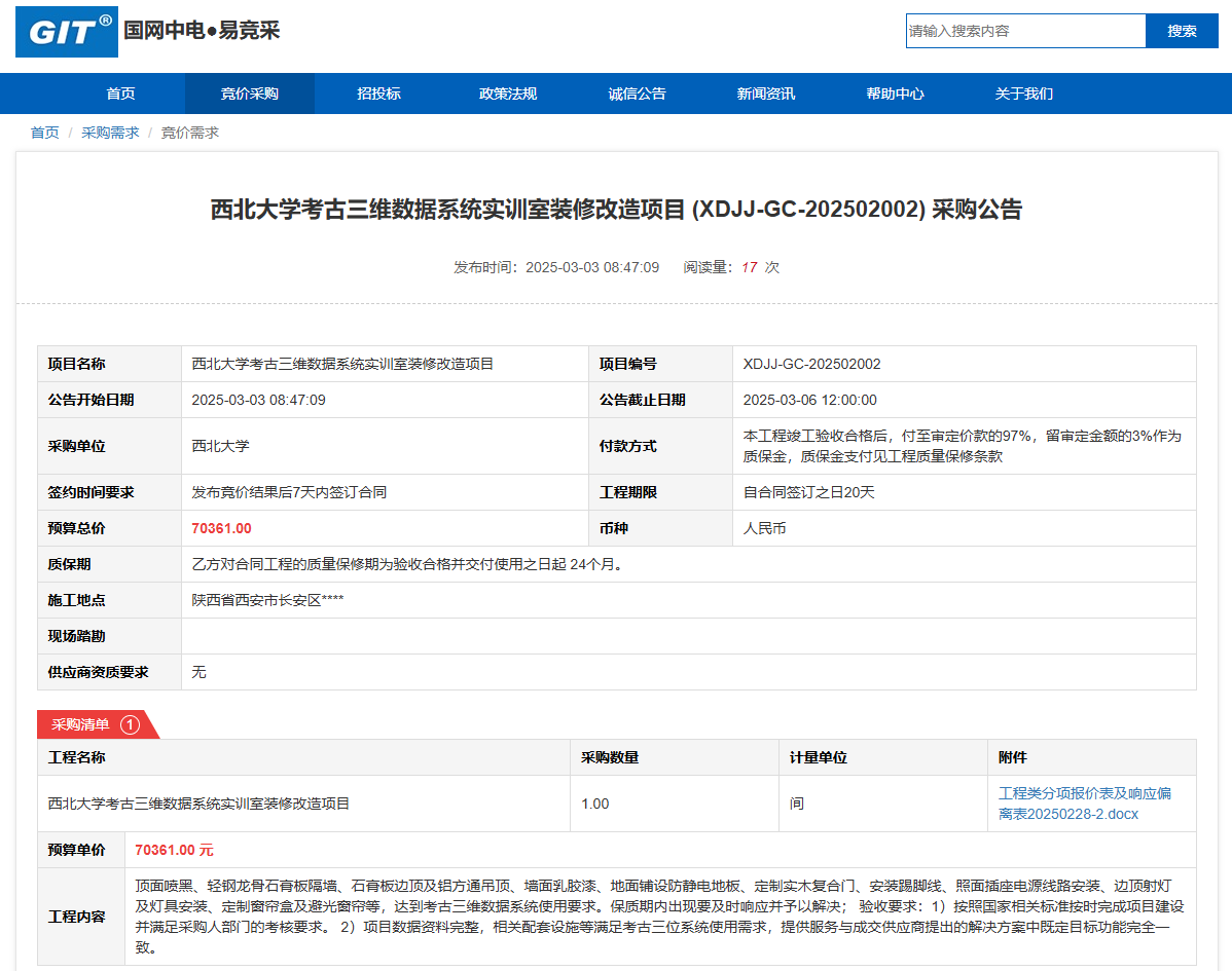 广发体育考古三维数据系统实训室装修改造项目(XDJJ-GC-202502002)竞价采购公告 作者:采购与招标办公室 编辑: 时间:2025-03-03 原公告链接:https://www.ejingcai.com.cn/site/bidding/detail/16671