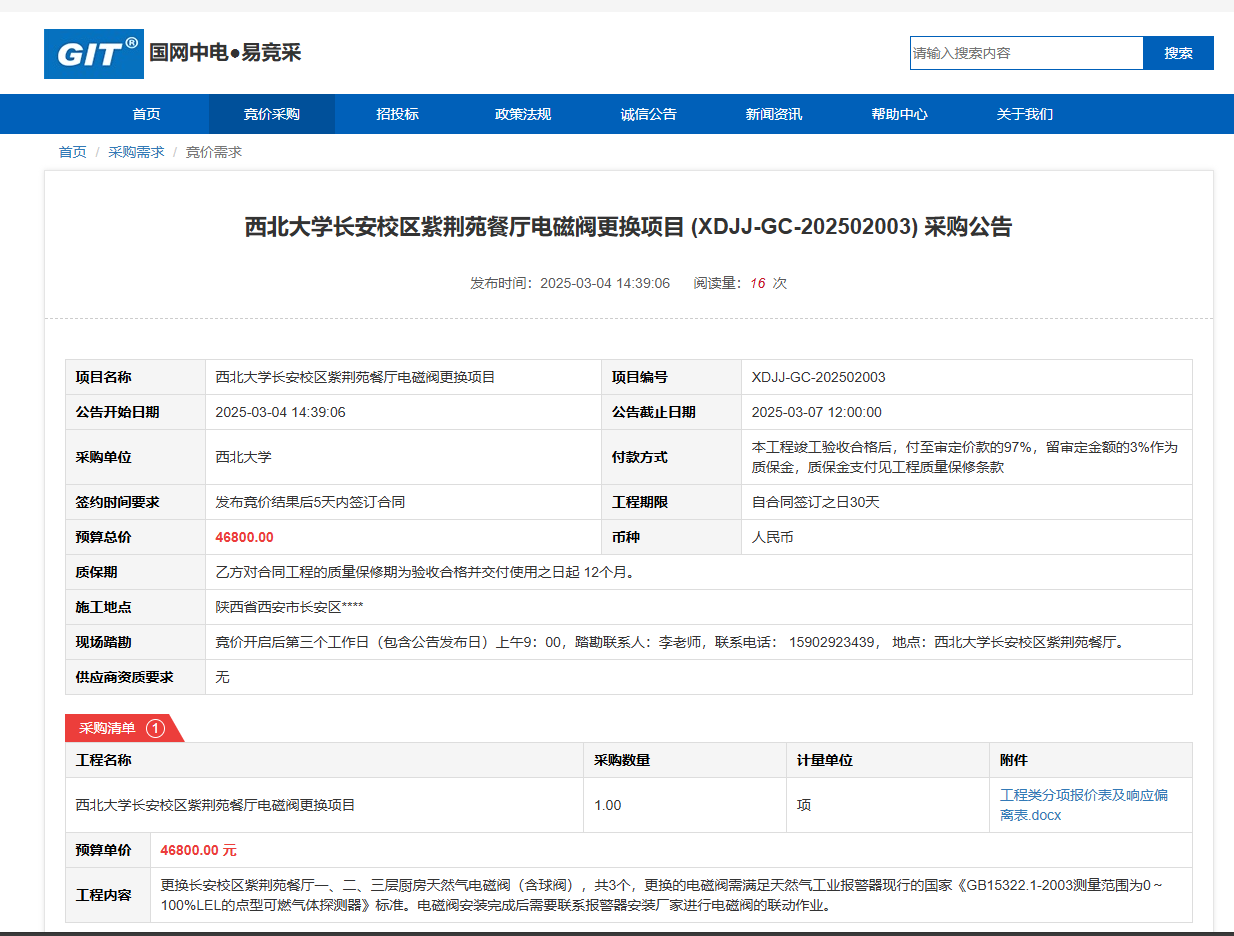 广发体育长安校区紫荆苑餐厅电磁阀更换项目(XDJJ-GC-202502003)竞价采购公告 作者:采购与招标办公室 编辑: 时间:2025-03-04 原公告链接:https://www.ejingcai.com.cn/site/bidding/detail/16712