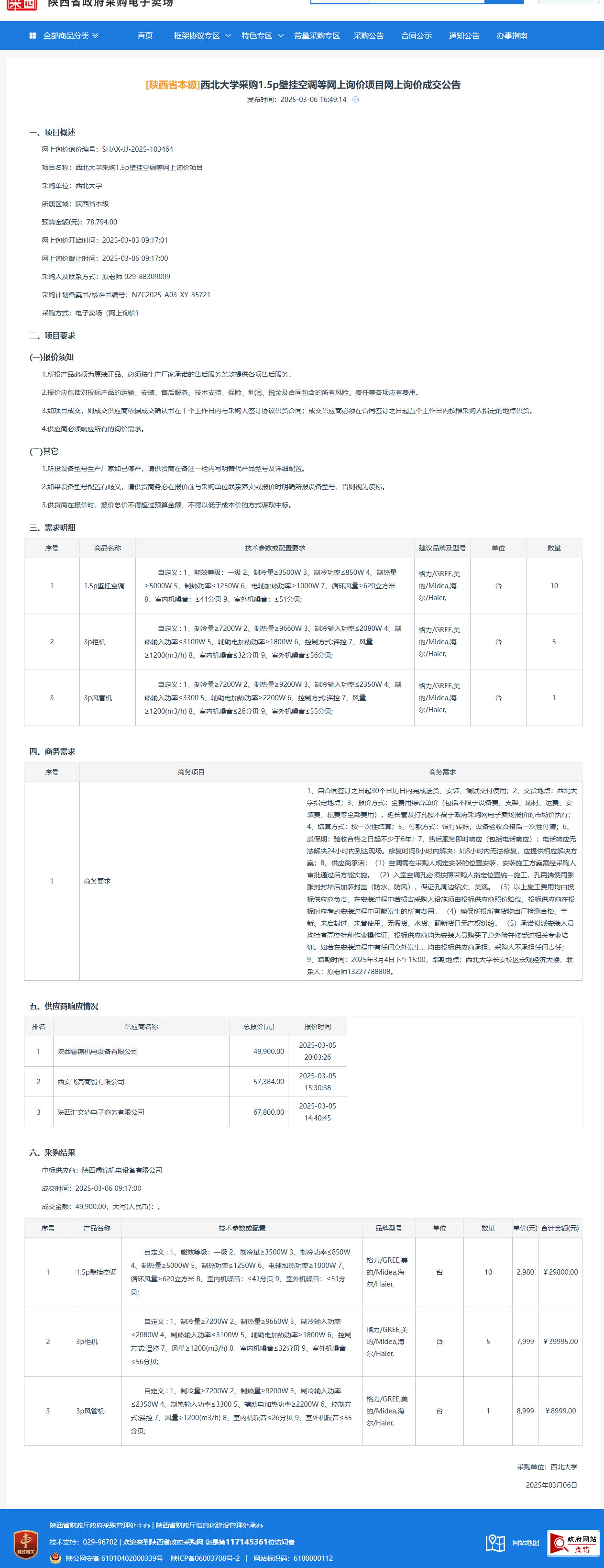 广发体育采购1.5p壁挂空调等网上询价项目(网上询价)成交公告 作者:采购与招标办公室 编辑: 时间:2025-03-06 原公告链接:https://www.ccgp-shaanxi.gov.cn/gpmall-main-web/basic/noticeDetail?noticeGuid=7296717914839908352
