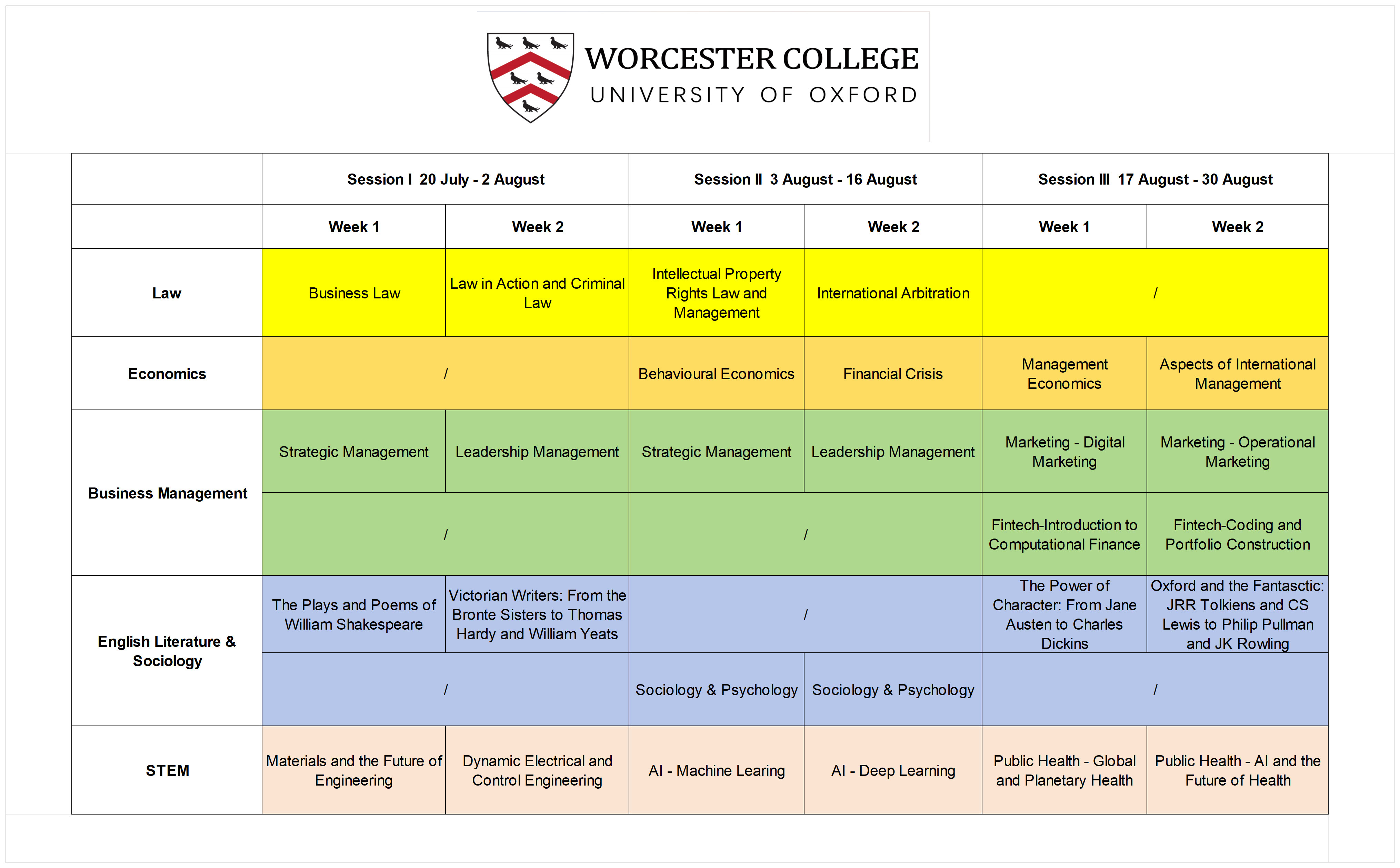 牛津大学Worcester College暑期证书项目提供多个学科板块的学术课程,包括法律、经济、商务、英国文学、STEM等。暑假开设三期,一期2周,每两周选择一门专业课程,学生可以选择参加为期两周或者四周的密集学术课程,与全球学生一起体验牛津大学的教学模式和学术氛围,项目信息详见附件1项目手册。