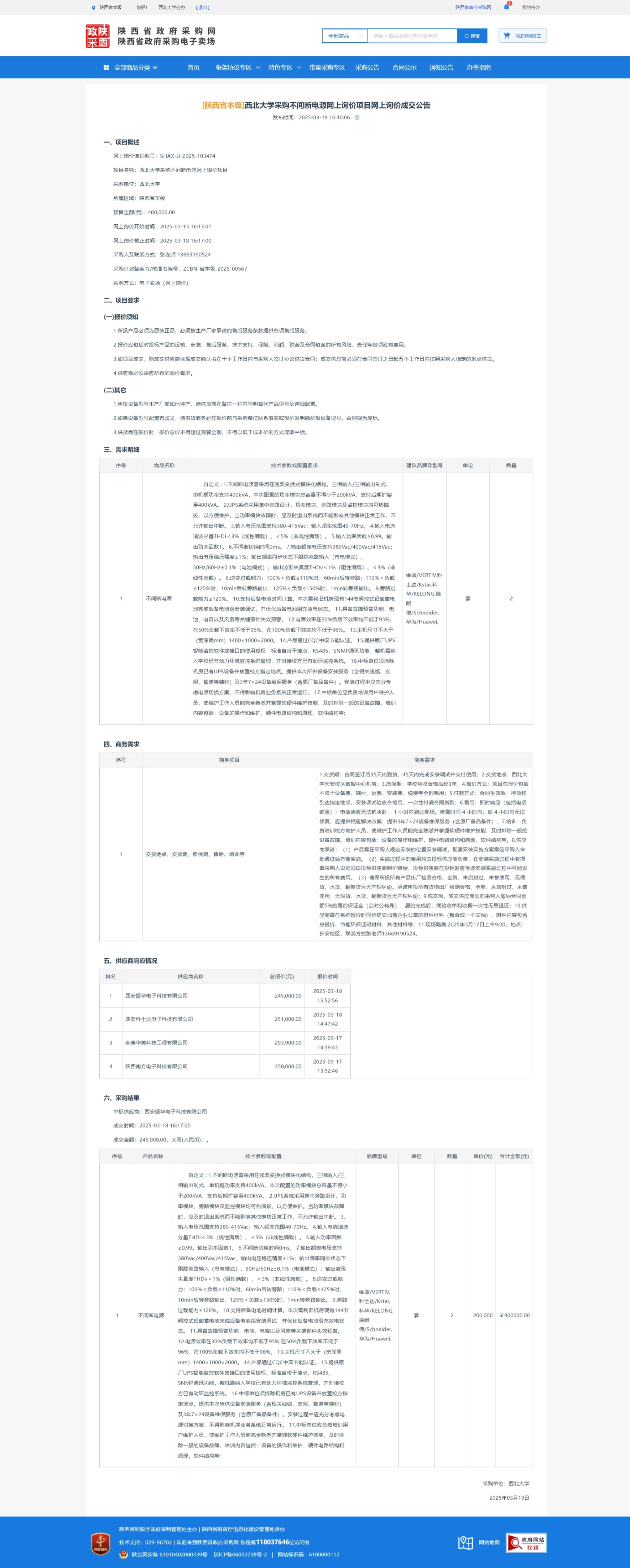广发体育采购不间断电源网上询价项目网上询价成交公告 作者: 编辑:采购与招标办公室 时间:2025-03-19 原公告链接:https://www.ccgp-shaanxi.gov.cn/gpmall-main-web/basic/noticeDetail?noticeGuid=7301336059869331456