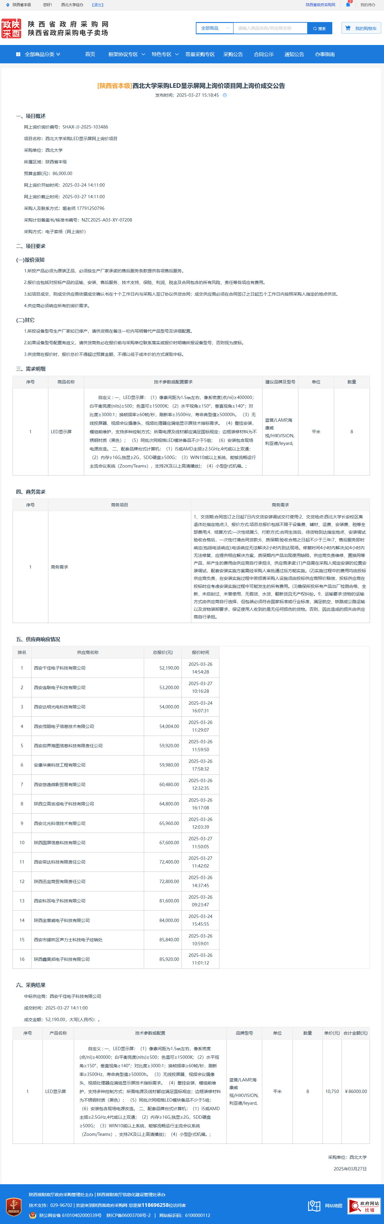 广发体育采购LED显示屏网上询价项目网上询价成交公告 作者:采购与招标办公室 编辑: 时间:2025-03-27 原公告链接:https://www.ccgp-shaanxi.gov.cn/gpmall-main-web/basic/noticeDetail?noticeGuid=7304305287710834688