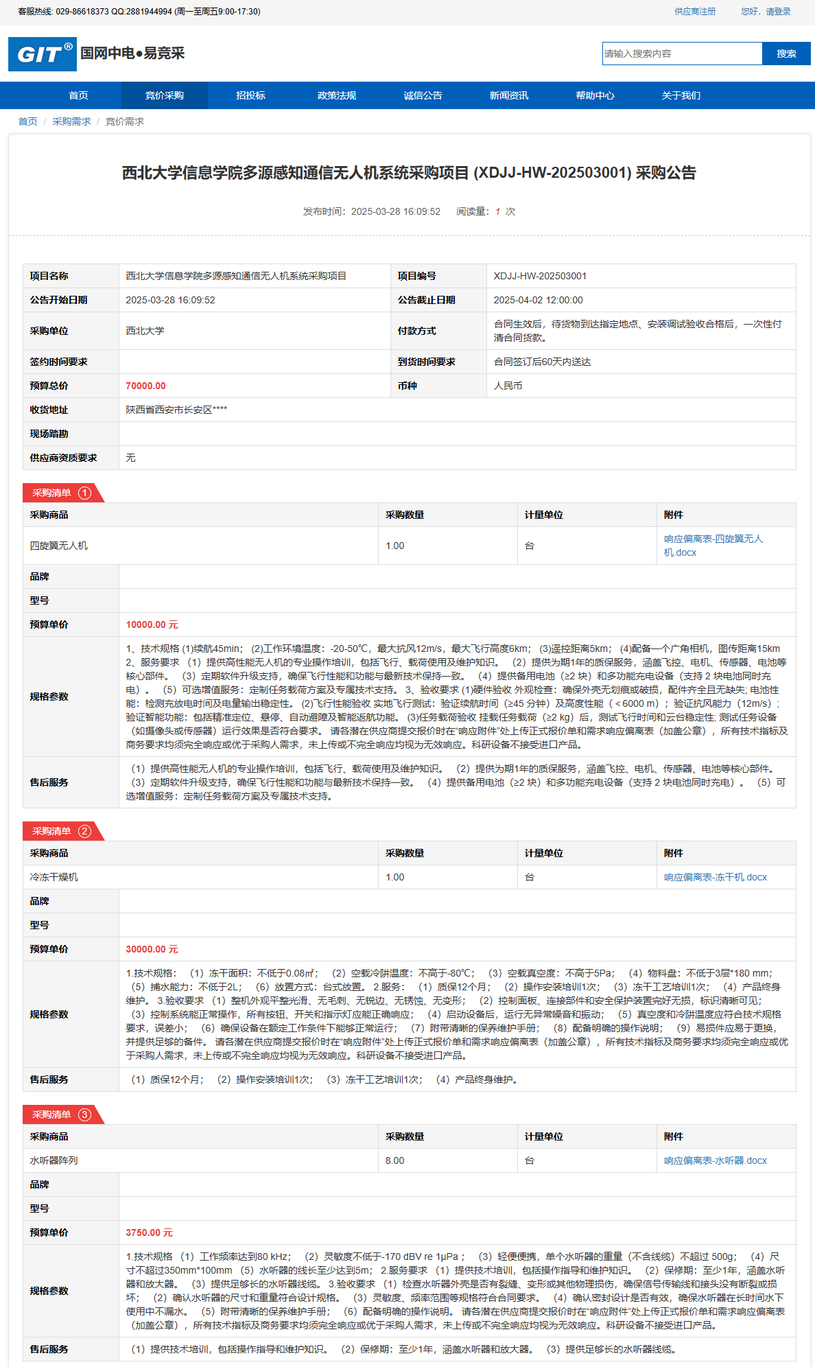 广发体育信息学院多源感知通信无人机系统采购项目(XDJJ-HW-202503001)竞价采购公告 作者:采购与招标办公室 编辑: 时间:2025-03-28 原公告链接:https://www.ejingcai.com.cn/site/bidding/detail/17255