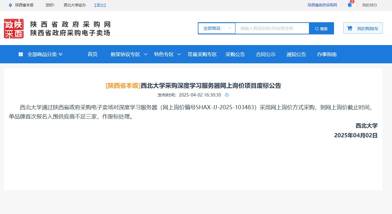 广发体育采购深度学习服务器网上询价项目废标公告 作者:采购与招标办公室 编辑: 时间:2025-04-02 原公告链接:https://www.ccgp-shaanxi.gov.cn/gpmall-main-web/basic/noticeDetail?noticeGuid=7306497670795952128