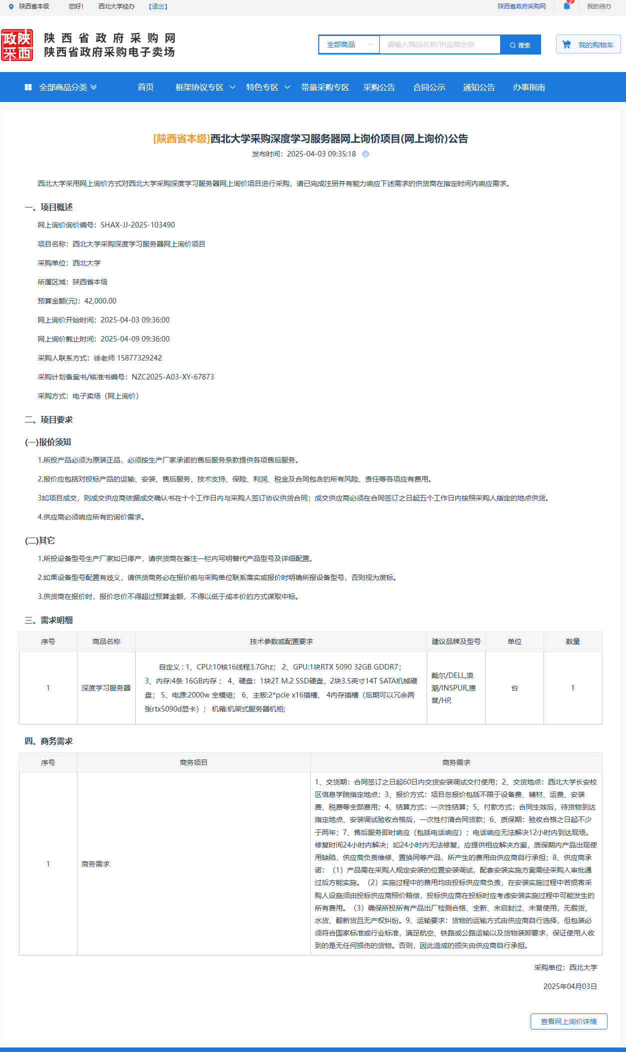 广发体育采购深度学习服务器网上询价项目(网上询价)公告 作者:采购与招标办公室 编辑: 时间:2025-04-03 原公告链接:https://www.ccgp-shaanxi.gov.cn/gpmall-main-web/basic/noticeDetail?noticeGuid=7306755570823004160