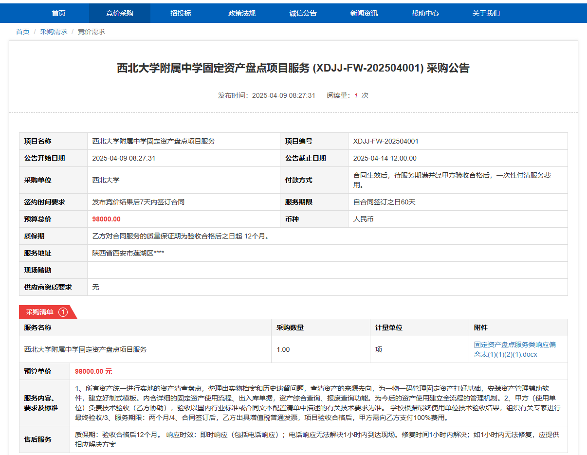 广发体育附属中学固定资产盘点项目服务(XDJJ-FW-202504001)竞价采购公告 作者:采购与招标办公室 编辑: 时间:2025-04-09 原公告链接:https://www.ejingcai.com.cn/site/bidding/detail/17501
