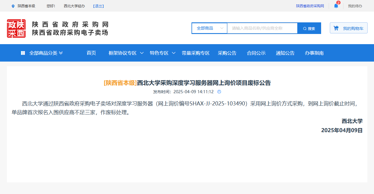 广发体育采购深度学习服务器网上询价项目废标公告 作者:采购与招标办公室 编辑: 时间:2025-04-09 原公告链接:https://www.ccgp-shaanxi.gov.cn/gpmall-main-web/basic/noticeDetail?noticeGuid=7308999329707130880