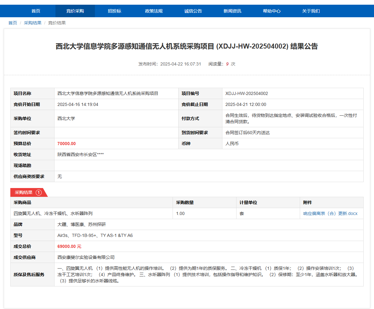 广发体育信息学院多源感知通信无人机系统采购项目 (XDJJ-HW-202504002) 结果公告 作者:采购与招标办公室 编辑: 时间:2025-04-22 原公告链接:https://www.ejingcai.com.cn/site/bidding/detail/17844
