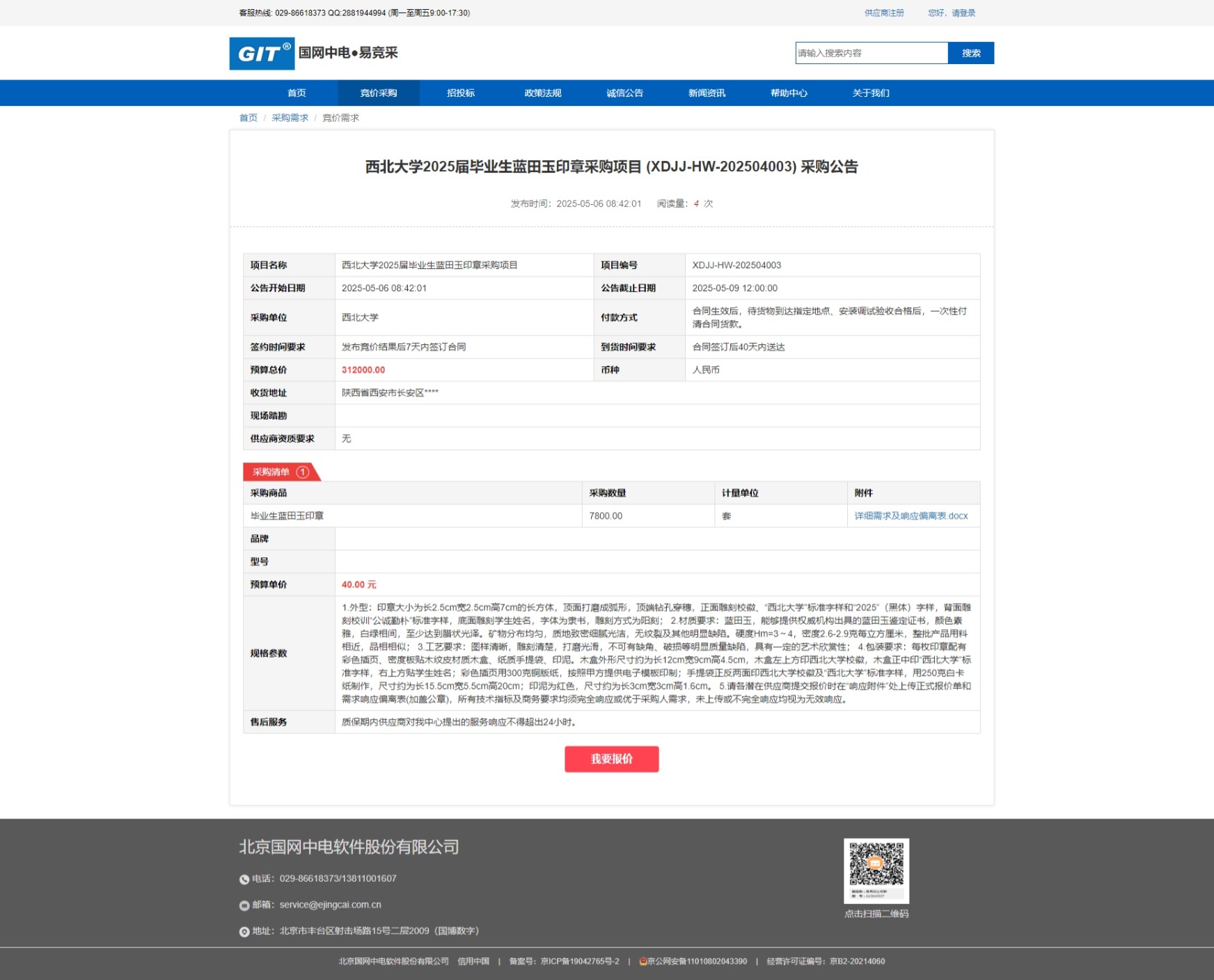 广发体育2025届毕业生蓝田玉印章采购项目 (XDJJ-HW-202504003) 竞价采购公告 作者: 编辑:采购与招标办公室 时间:2025-05-06 原公告链接:https://www.ejingcai.com.cn/site/bidding/detail/18026
