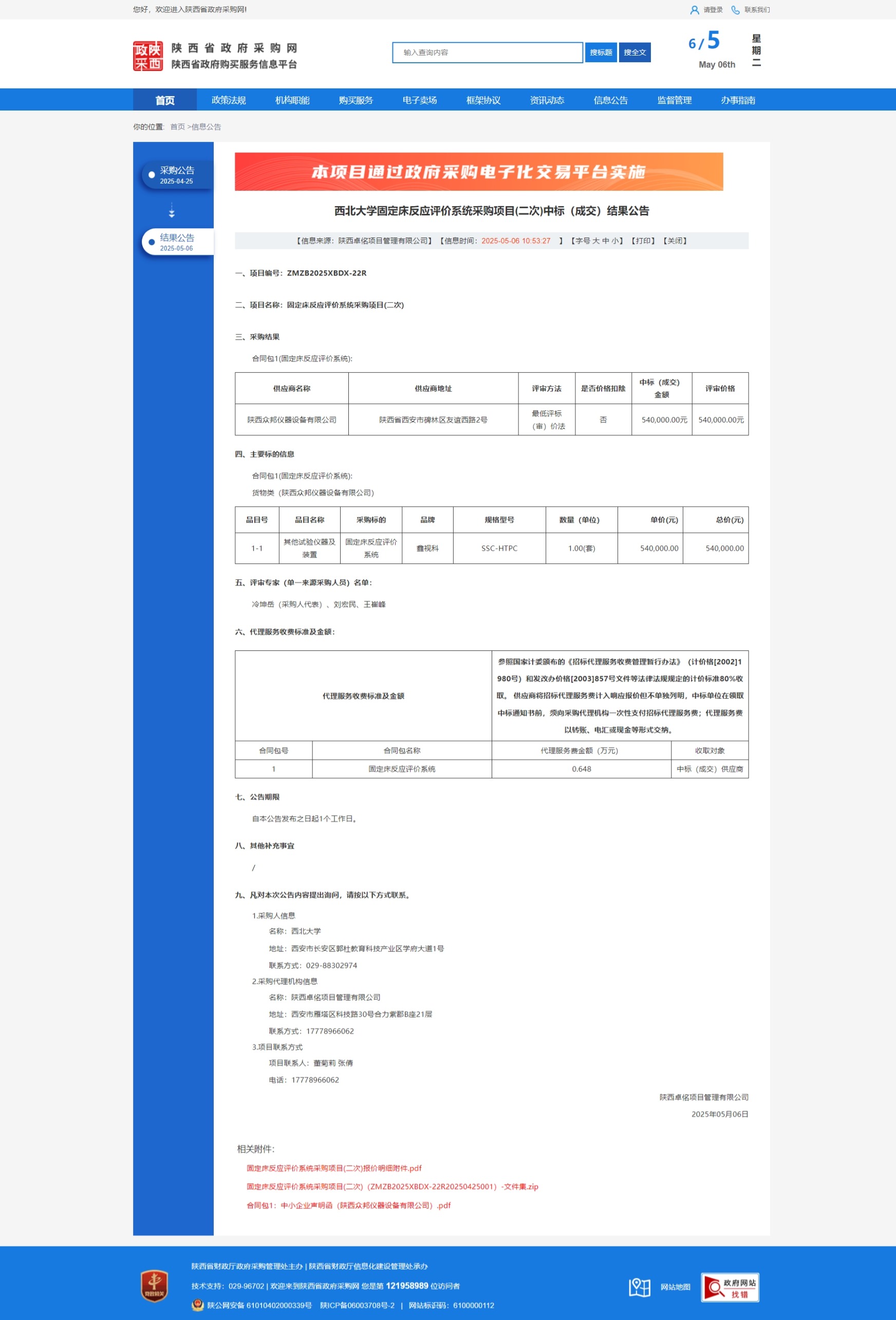 广发体育固定床反应评价系统采购项目(二次)中标(成交)结果公告 作者: 编辑:采购与招标办公室 时间:2025-05-06 原公告链接:https://www.ccgp-shaanxi.gov.cn/freecms/site/shaanxi/ggxx/info/2025/8a69c0a2967206000196a355be75555d.html?noticeType=001023¬iceId=2cacf8fa-2a27-11f0-8063-08c0eb20c666
