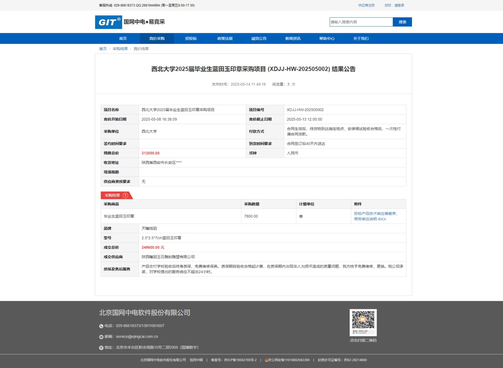 广发体育2025届毕业生蓝田玉印章采购项目 (XDJJ-HW-202505002) 竞价结果公告 作者: 编辑:采购与招标办公室 时间:2025-05-14 原公告链接:https://www.ejingcai.com.cn/site/bidding/detail/18215