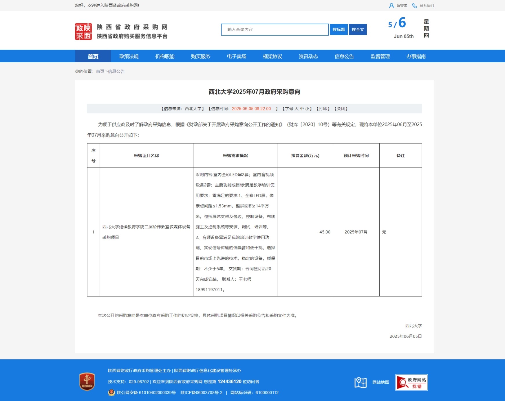 广发体育2025年07月政府采购意向 作者: 编辑:采购与招标办公室 时间:2025-06-05 原公告链接:https://www.ccgp-shaanxi.gov.cn/freecms/site/shaanxi/ggxx/info/2025/8a69c8d196ce440a01973d667fcf58b5.html?noticeType=59¬iceId=0a572344-41a5-11f0-8063-08c0eb20c666
