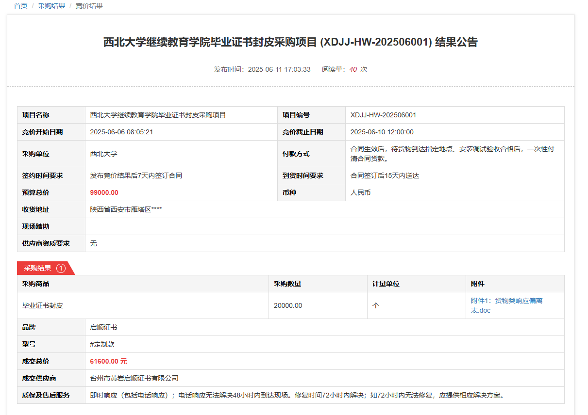 广发体育继续教育学院毕业证书封皮采购项目(XDJJ-HW-202506001)竞价结果公告 作者:采购与招标办公室 编辑: 时间:2025-06-12 原公告链接:https://www.ejingcai.com.cn/site/bidding/detail/18846