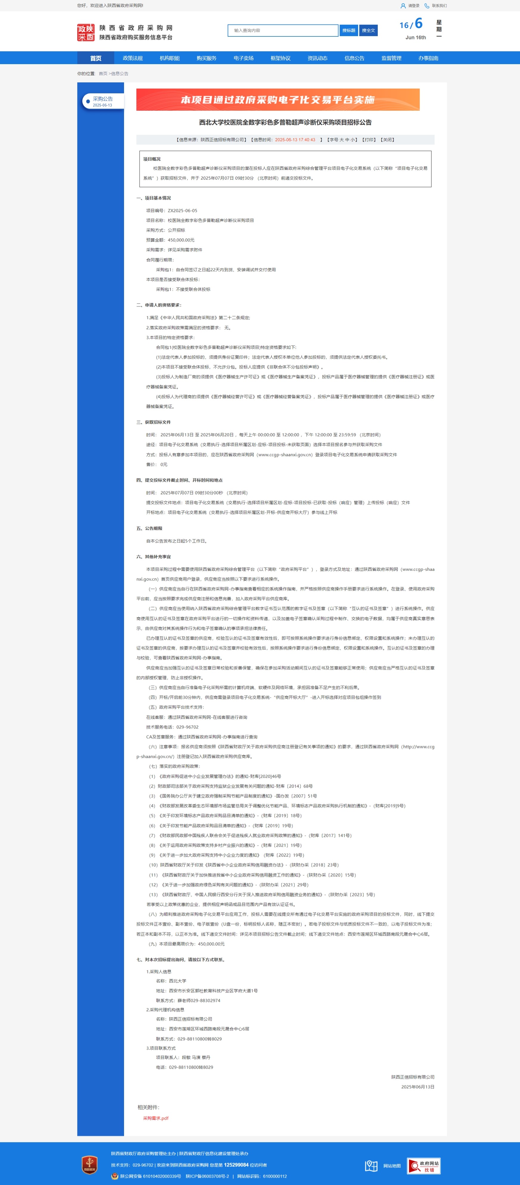 广发体育校医院全数字彩色多普勒超声诊断仪采购项目招标公告 作者: 编辑:采购与招标办公室 时间:2025-06-16 原公告链接:https://www.ccgp-shaanxi.gov.cn/freecms/site/shaanxi/ggxx/info/2025/8a69c6749714a43701976892e3823fce.html?noticeType=001011¬iceId=6edbc741-483c-11f0-8063-08c0eb20c666