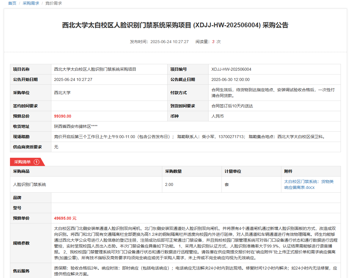 广发体育太白校区人脸识别门禁系统采购项目(XDJJ-HW-202506004)竞价采购公告 作者: 编辑: 时间:2025-06-24 原公告链接:https://www.ejingcai.com.cn/site/bidding/detail/19128