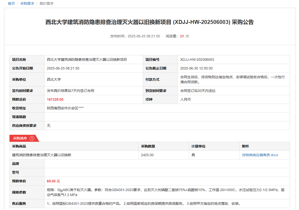 广发体育建筑消防隐患排查治理灭火器以旧换新项目(XDJJ-HW-202506003)竞价采购公告 作者:采购与招标办公室 编辑: 时间:2025-06-25 原公告链接:https://www.ejingcai.com.cn/site/bidding/detail/19167