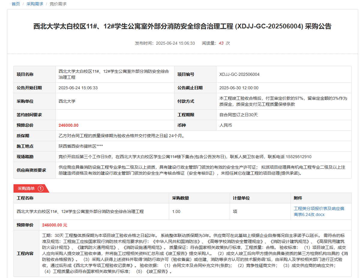 广发体育太白校区11#、12#学生公寓室外部分消防安全综合治理工程(XDJJ-GC-202506004)竞价采购公告 作者:采购与招标办公室 编辑: 时间:2025-06-25 原公告链接:https://www.ejingcai.com.cn/site/bidding/detail/19136