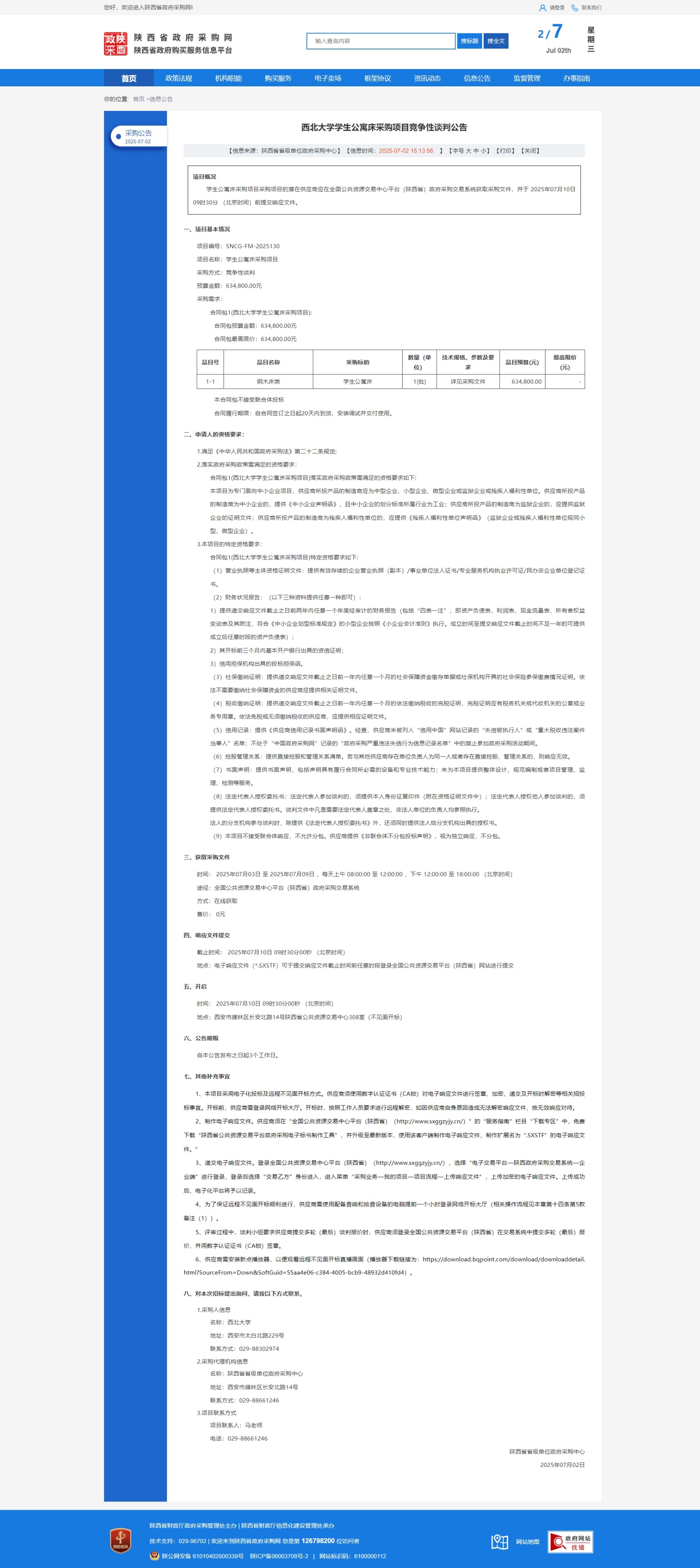 广发体育学生公寓床采购项目竞争性谈判公告 作者: 编辑:采购与招标办公室 时间:2025-07-02 原公告链接:https://www.ccgp-shaanxi.gov.cn/freecms/site/shaanxi/ggxx/info/2025/8a69c67497a9ff030197c8e900a9510c.html?noticeType=001013¬iceId=1bd2af55-5716-11f0-8063-08c0eb20c666