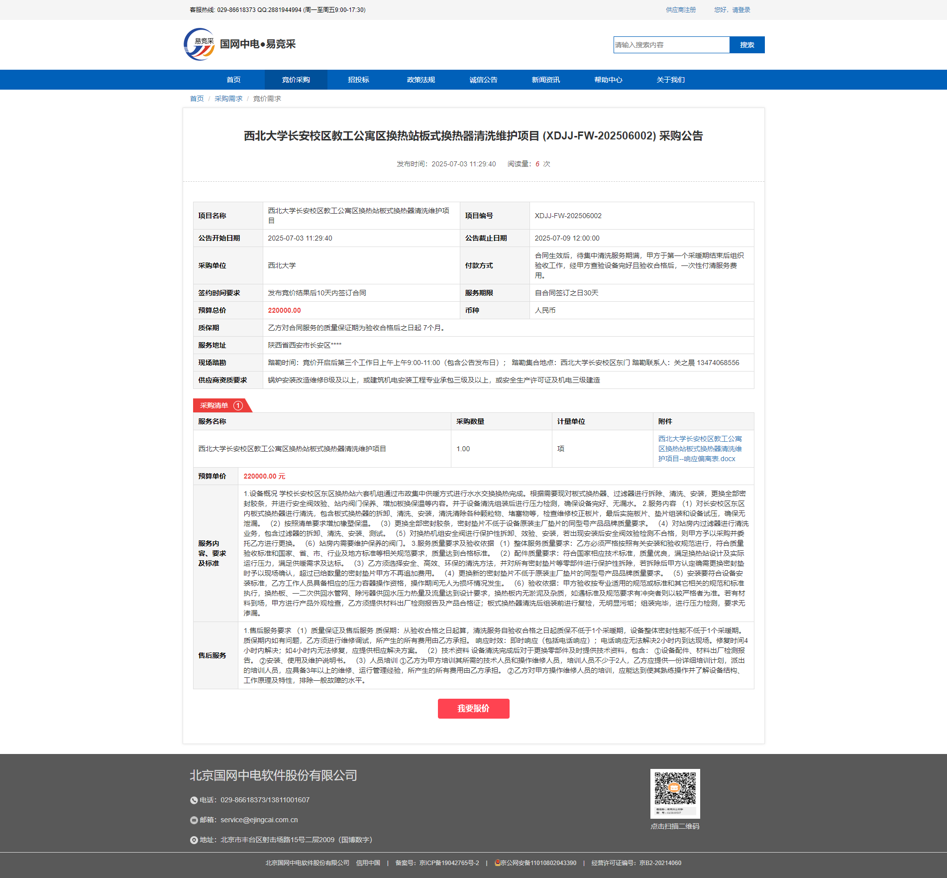 广发体育长安校区教工公寓区换热站板式换热器清洗维护项目 (XDJJ-FW-202506002) 采购公告