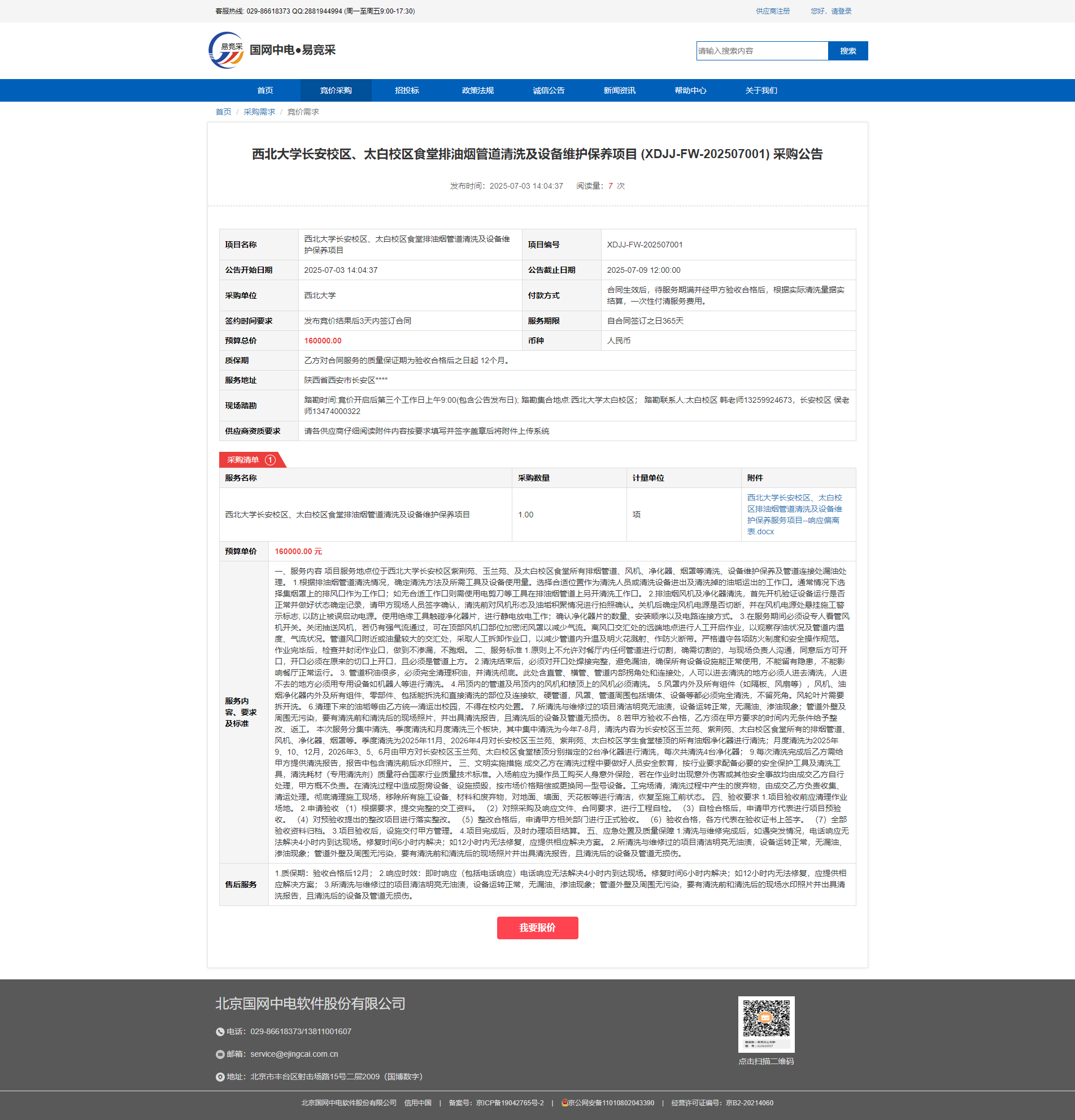 广发体育长安校区、太白校区食堂排油烟管道清洗及设备维护保养项目 (XDJJ-FW-202507001) 采购公告