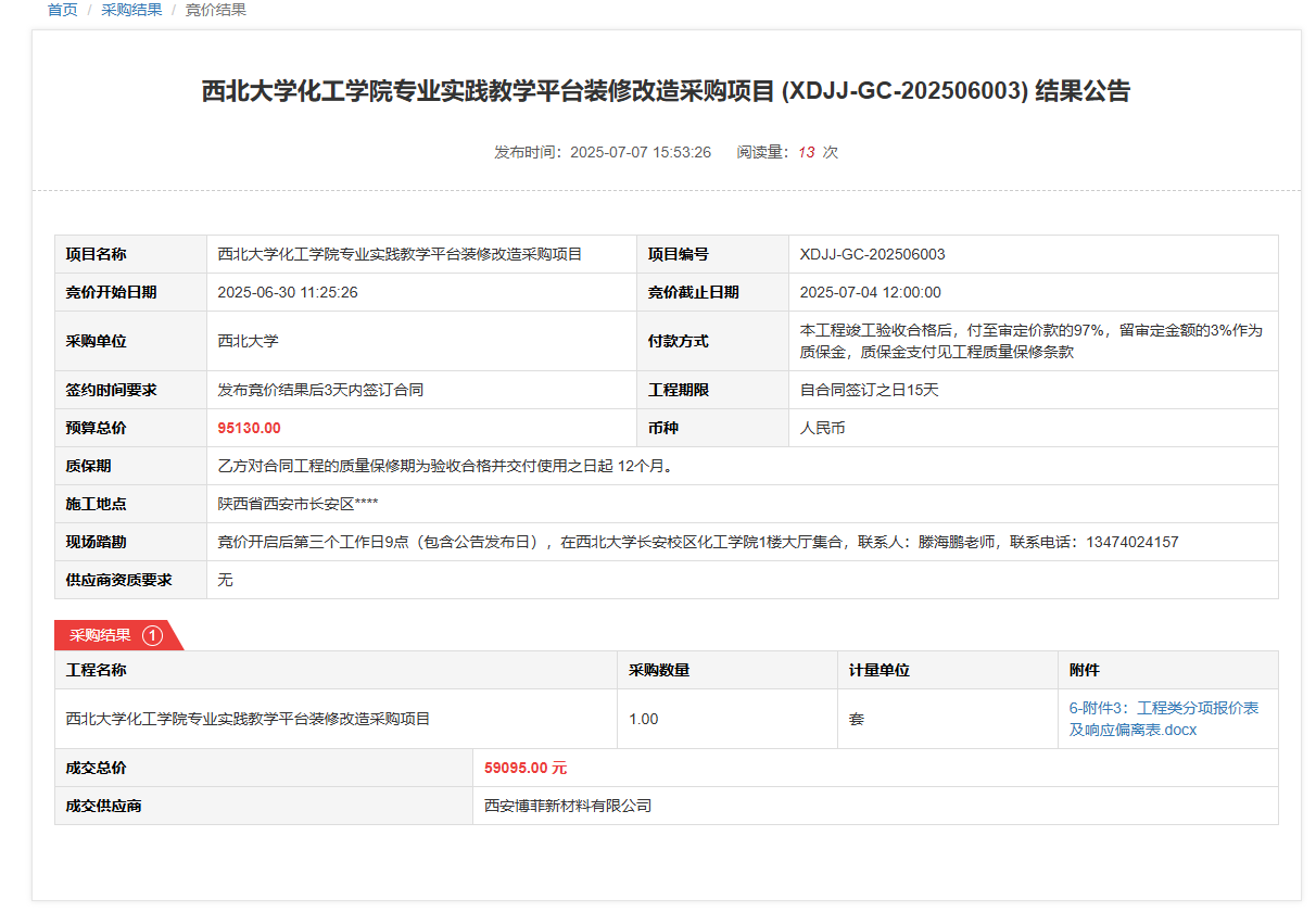 广发体育化工学院专业实践教学平台装修改造采购项目(XDJJ-GC-202506003)竞价结果公告