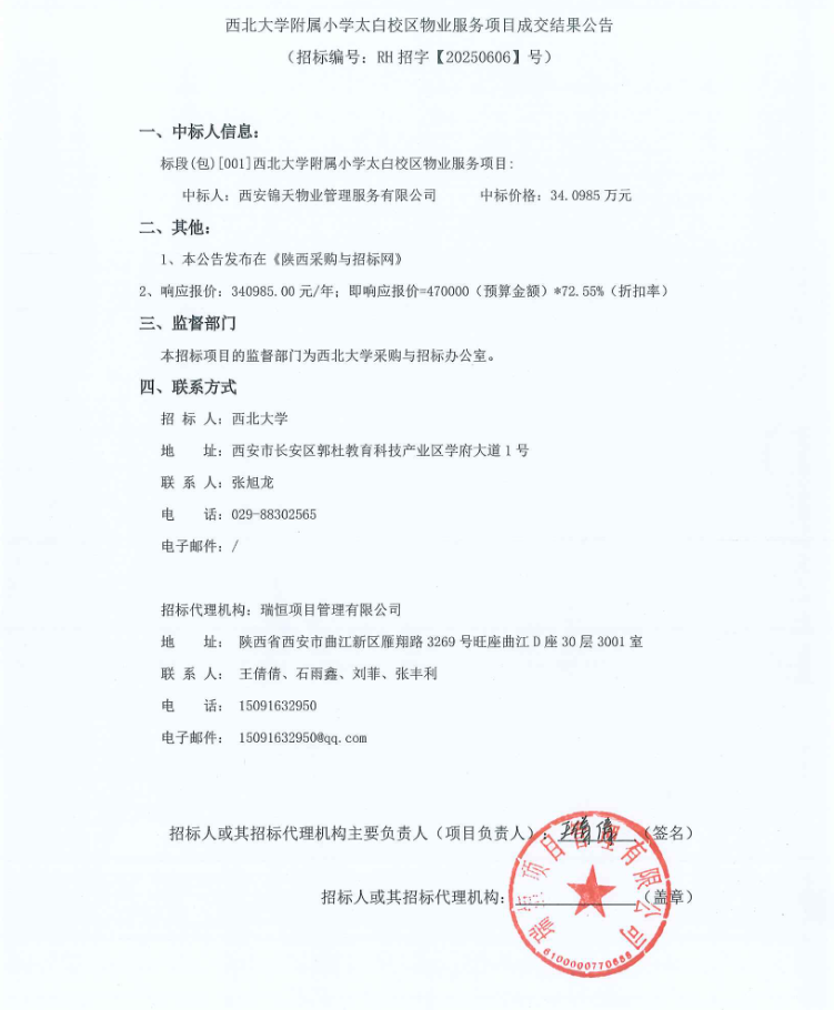 广发体育附属小学太白校区物业服务项目成交结果公告