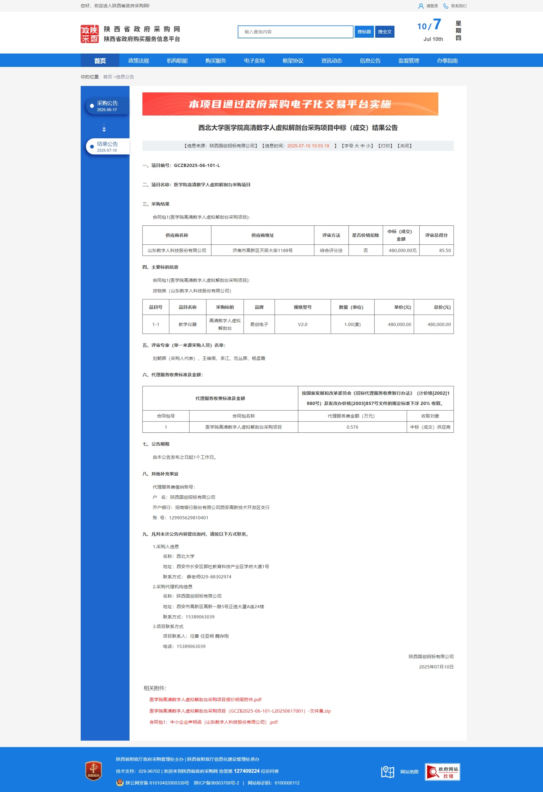 广发体育医学院高清数字人虚拟解剖台采购项目中标(成交)结果公告 作者: 编辑:采购与招标办公室 时间:2025-07-10 原公告链接:https://www.ccgp-shaanxi.gov.cn/freecms/site/shaanxi/ggxx/info/2025/8a69c68e97dc6ae40197f20a507657ef.html?noticeType=001021¬iceId=0e03dc64-5d34-11f0-8063-08c0eb20c666