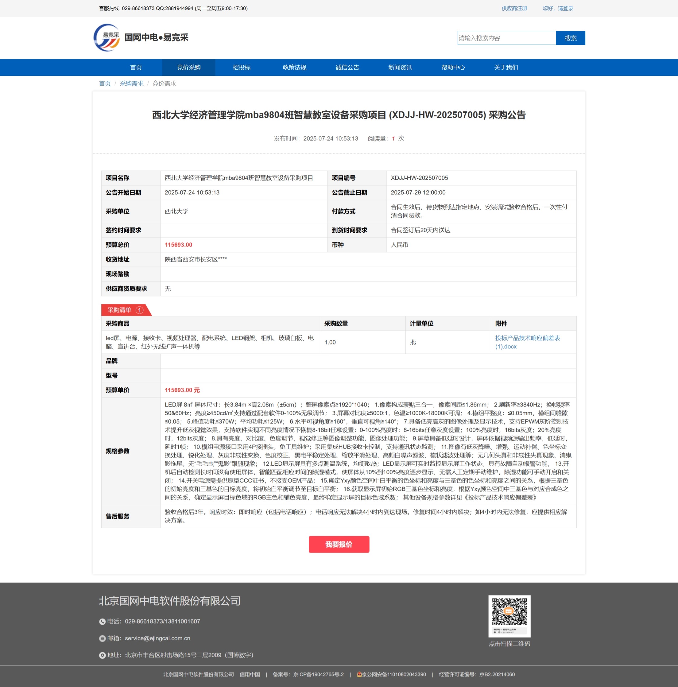 广发体育经济管理学院mba9804班智慧教室设备采购项目 (XDJJ-HW-202507005)竞价采购公告