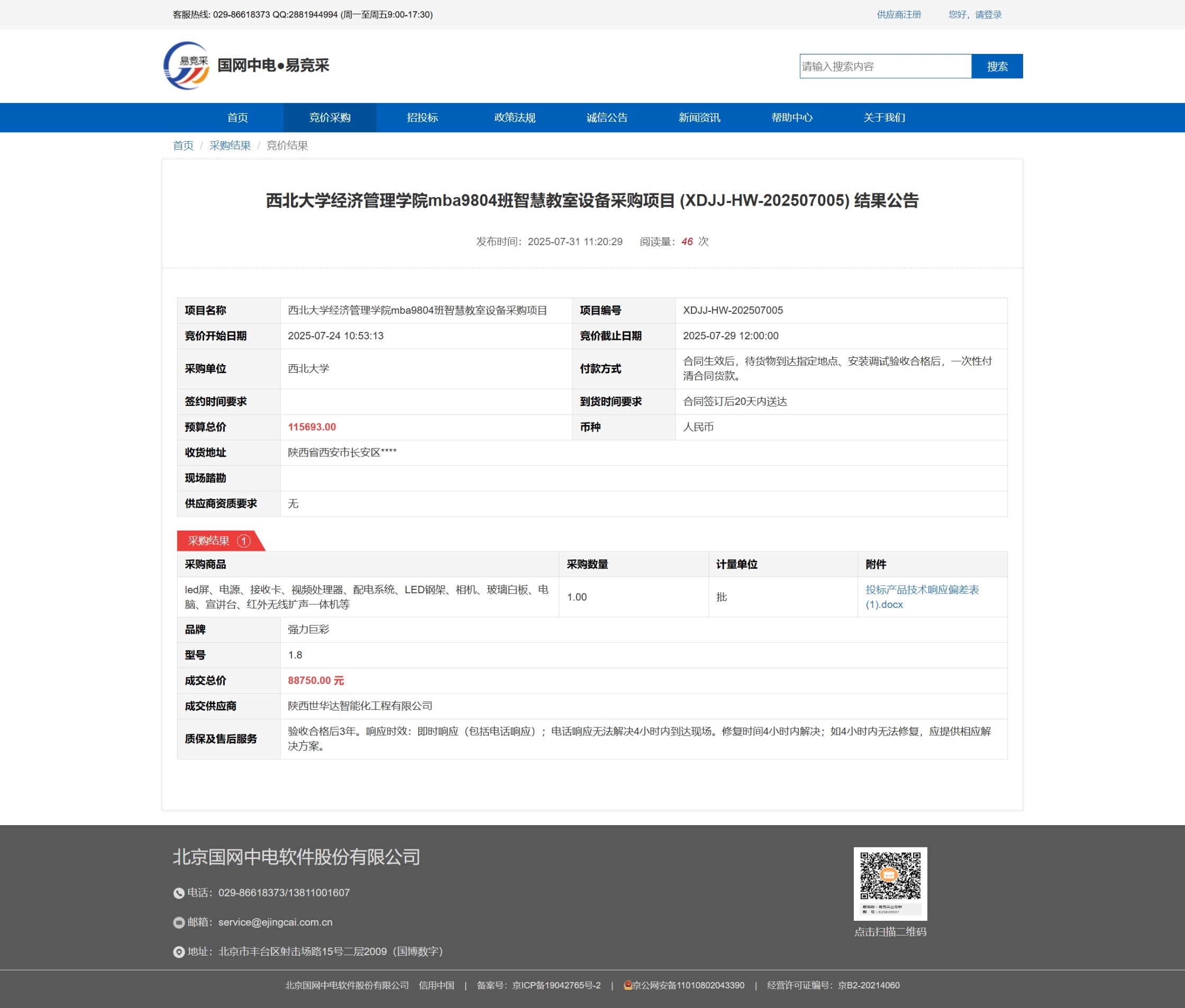 广发体育经济管理学院mba9804班智慧教室设备采购项目 (XDJJ-HW-202507005) 竞价结果公告 作者: 编辑:采购与招标办公室 时间:2025-07-31 原公告链接:https://www.ejingcai.com.cn/site/bidding/detail/19832