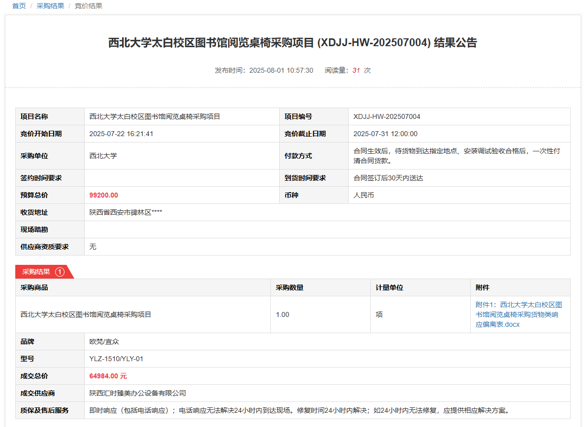 广发体育太白校区图书馆阅览桌椅采购项目(XDJJ-HW-202507004)竞价结果公告