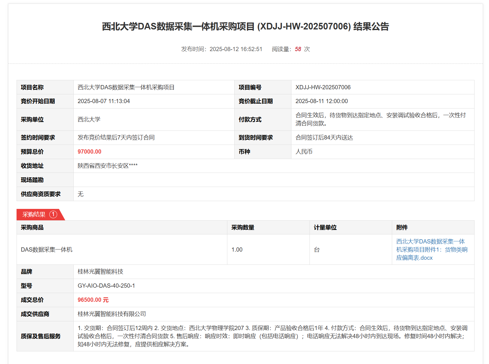 广发体育DAS数据采集一体机采购项目(XDJJ-HW-202507006)竞价结果公告