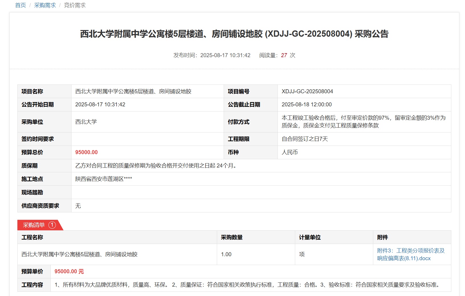 广发体育附属中学公寓楼5层楼道、房间铺设地胶(XDJJ-GC-202508004)竞价采购公告