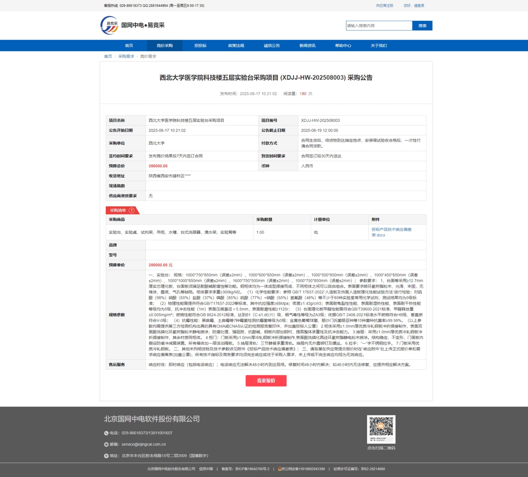 广发体育医学院科技楼五层实验台采购项目 (XDJJ-HW-202508003)竞价 采购公告 作者: 编辑:采购与招标办公室 时间:2025-08-18 原公告链接:https://www.ejingcai.com.cn/site/bidding/detail/19996