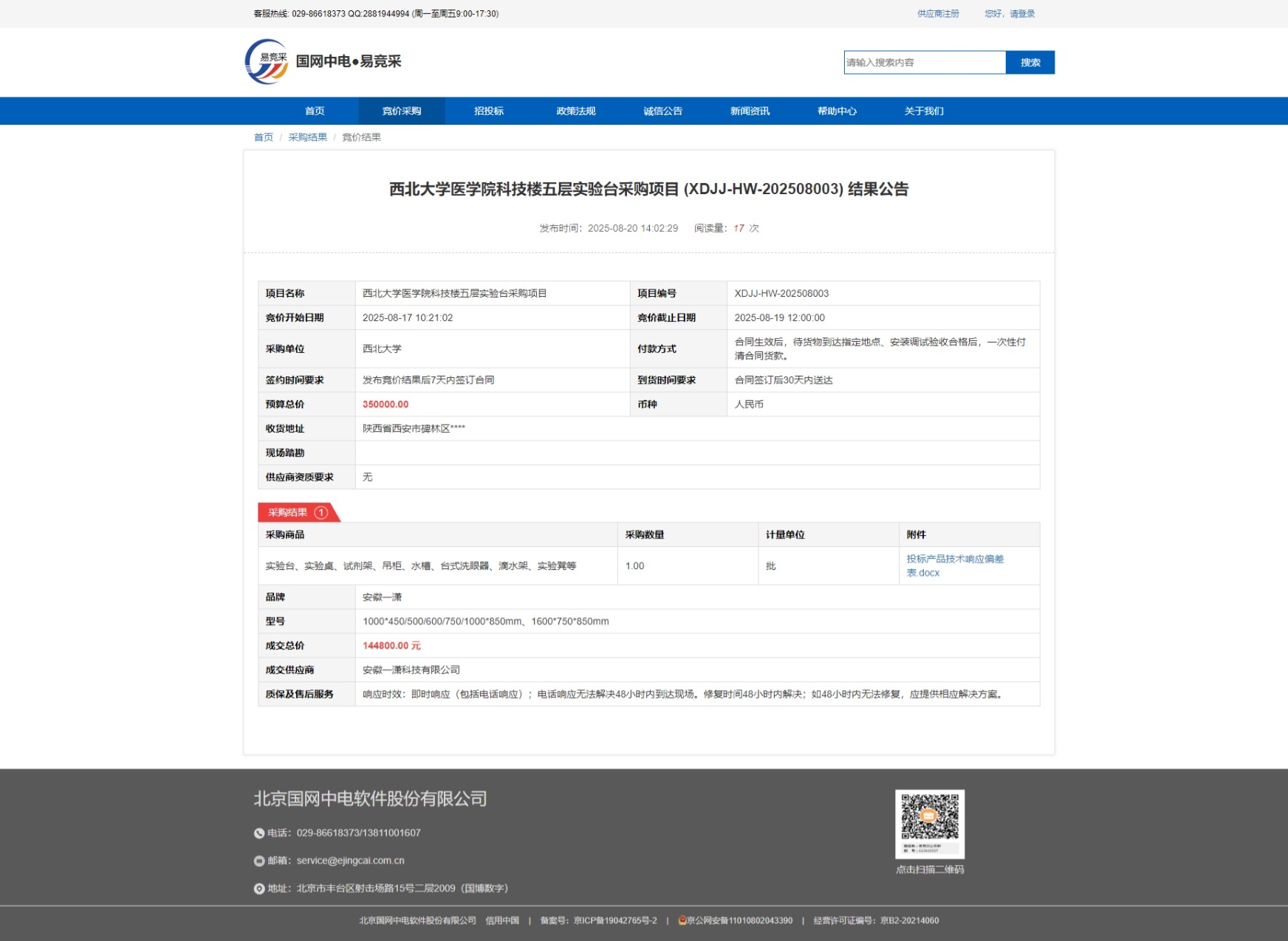 广发体育医学院科技楼五层实验台采购项目 (XDJJ-HW-202508003) 结果公告 作者: 编辑:采购与招标办公室 时间:2025-08-20 原公告链接:https://www.ejingcai.com.cn/site/bidding/detail/20040