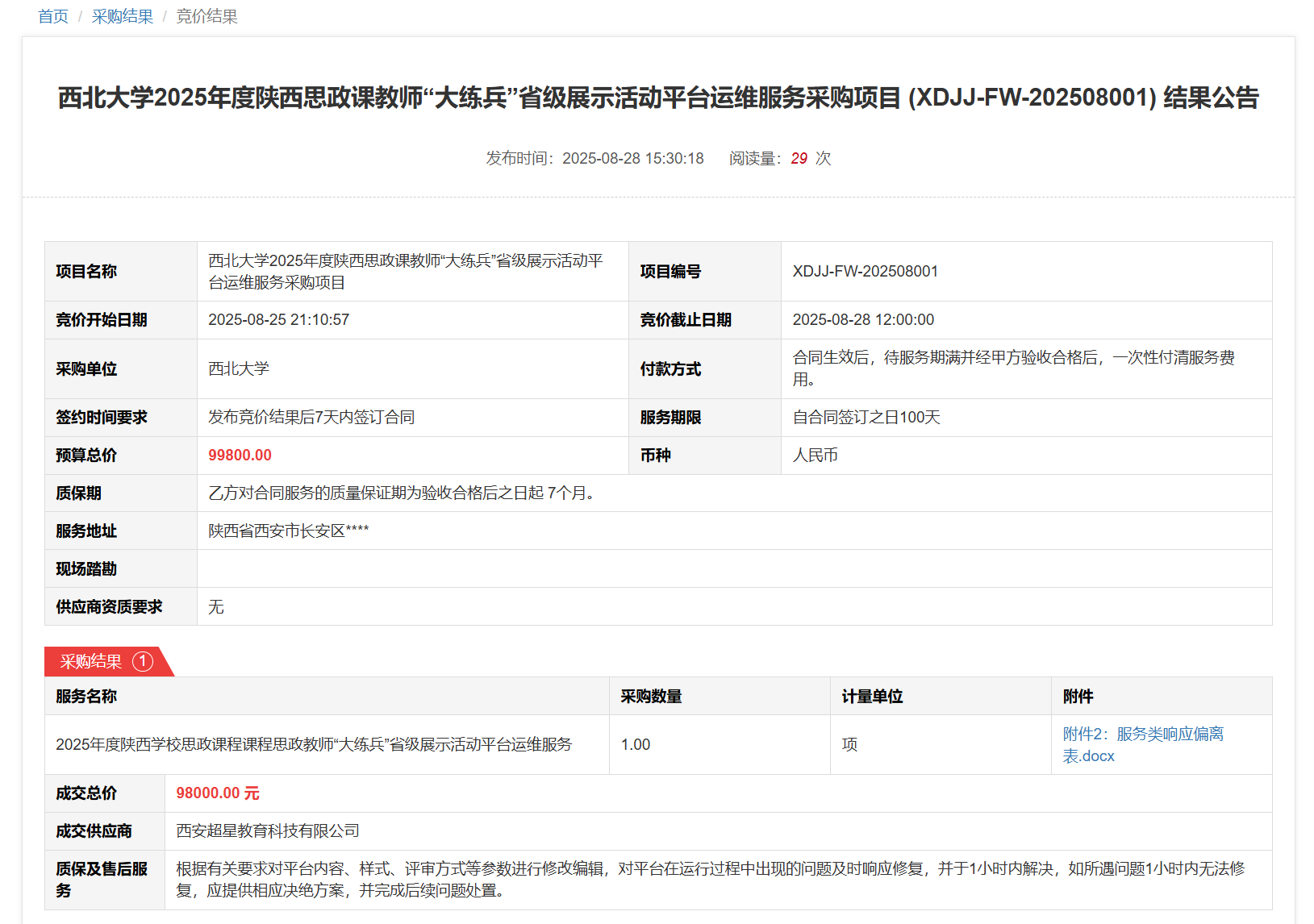 广发体育2025年度陕西思政课教师“大练兵”省级展示活动平台运维服务采购项目(XDJJ-FW-202508001)竞价结果公告