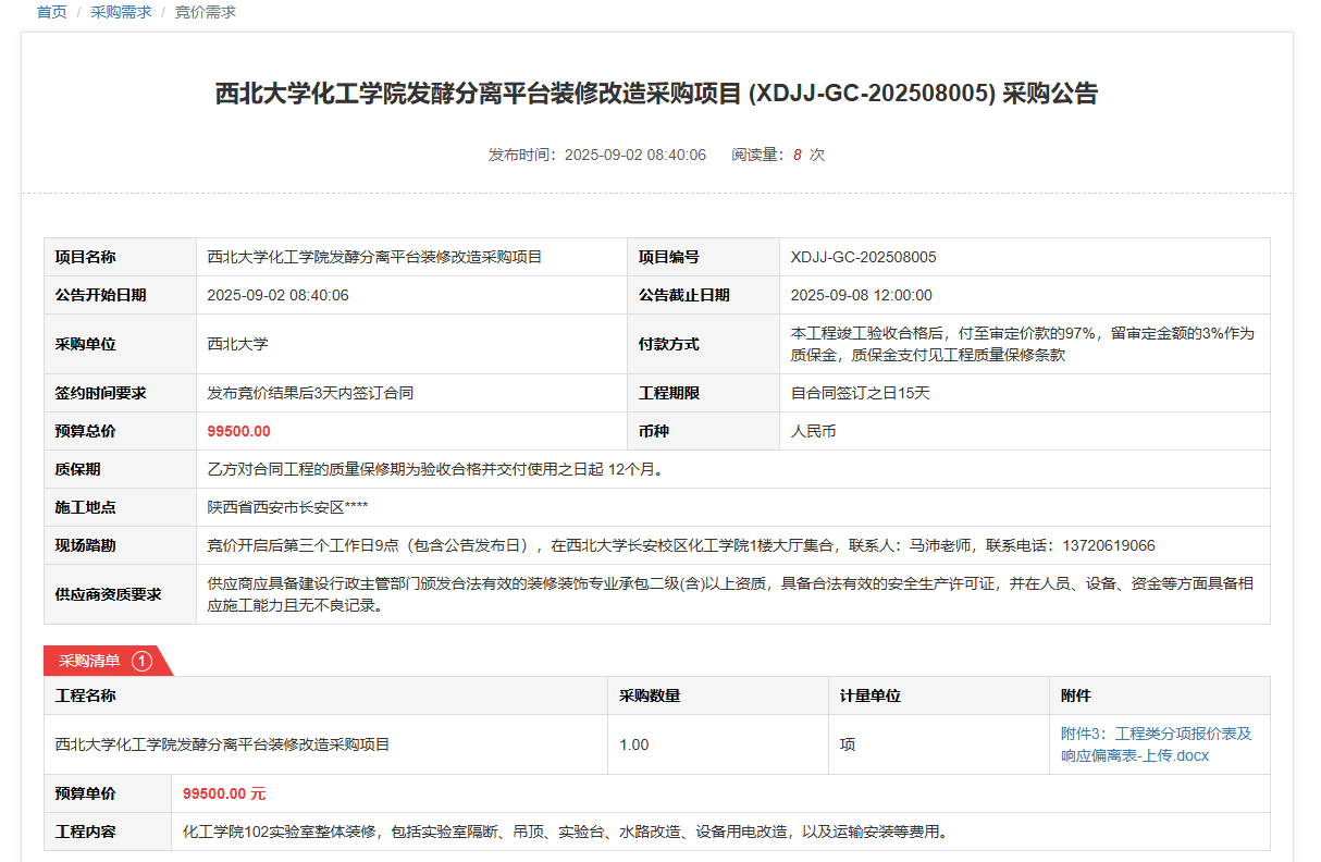 广发体育化工学院发酵分离平台装修改造采购项目(XDJJ-GC-202508005)竞价采购公告