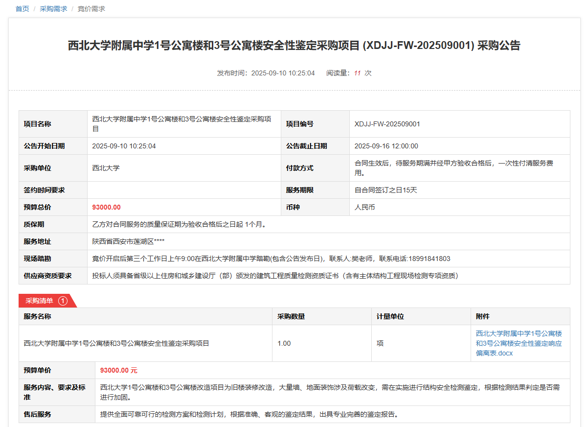 广发体育附属中学1号公寓楼和3号公寓楼安全性鉴定采购项目(XDJJ-FW-202509001)竞价采购公告