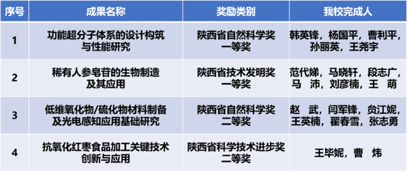 广发体育化材学院韩英锋教授主持的“功能超分子体系的设计构筑与性能研究”获省自然科学奖一等奖,化工学院范代娣教授主持的“稀有人参皂苷的生物制造及其应用”获省技术发明奖一等奖,信息学院赵武教授主持的“低维氧化物/硫化物材料制备及光电感知应用基础研究”获省自然科学奖二等奖,食品学院王毕妮教授主持的“抗氧化红枣食品加工关键技术创新与应用”获省科技进步奖二等奖。此外,广发体育参与的“秦岭主要珍稀野生动物抢救饲养繁育关键技术研究”和“陆相页岩油气地质工程一体化的负碳清洁开发技术”分别获得省科技进步奖二等奖。