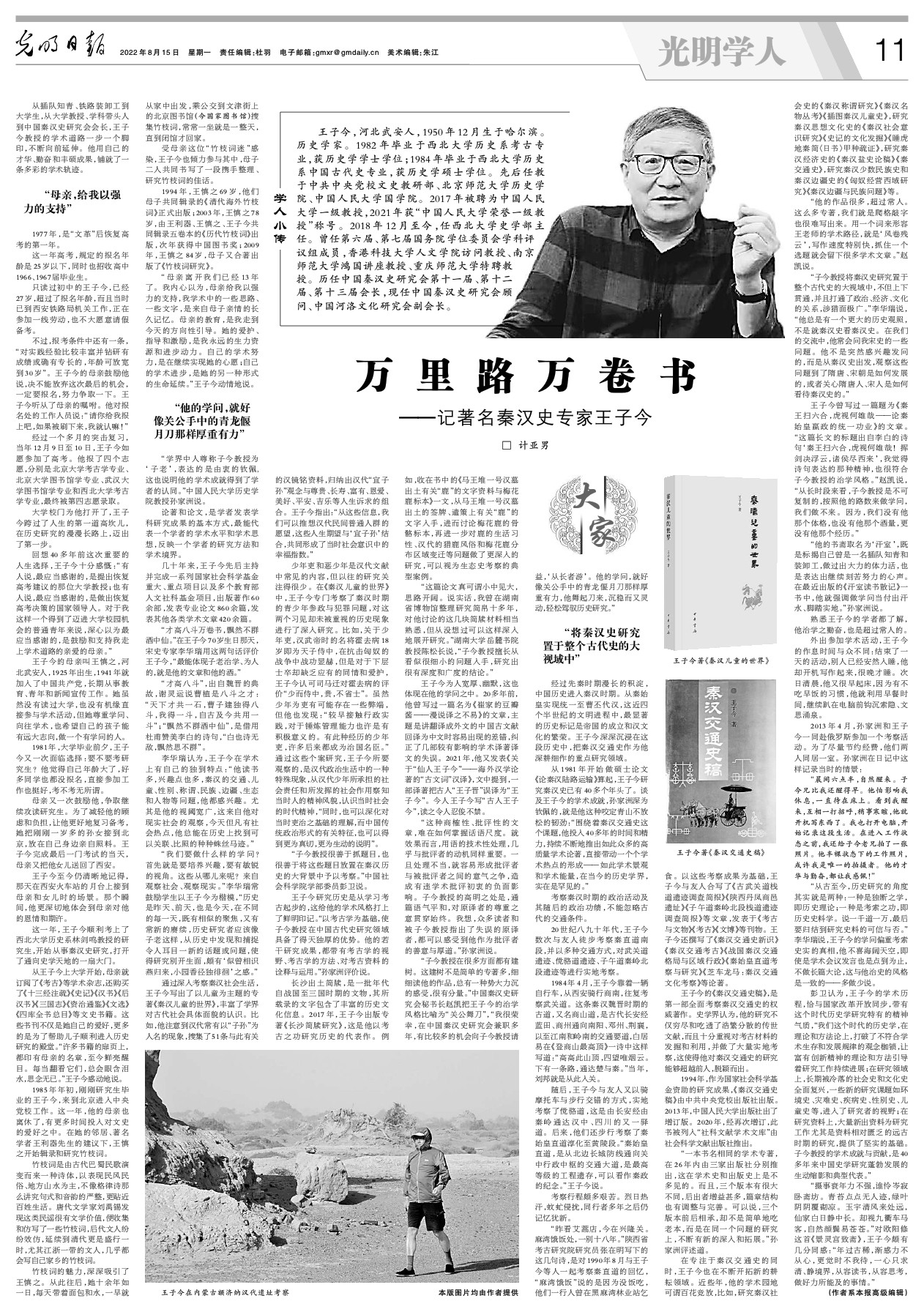 王子今曾写过一篇题为《秦王扫六合,虎视何雄哉——论秦始皇嬴政的统一功业》的文章。“这篇长文的标题出自李白的诗句‘秦王扫六合,虎视何雄哉!挥剑决浮云,诸侯尽西来’,我觉得诗句表达的那种精神,也很符合子今教授的治学风格。”赵凯说,“从长时段来看,子今教授是不可复制的,按照他的路数来做学问,我们做不来。因为,我们没有他那个体格,也没有他那个酒量,更没有他那个经历。”