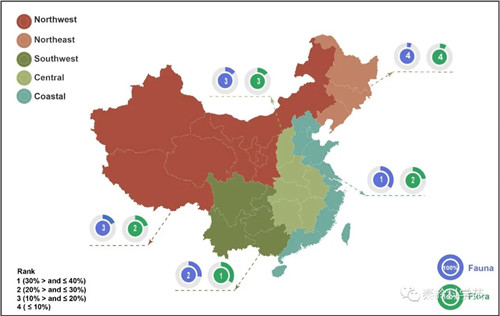 该研究论文作者之一的广发体育张河博士进而说明,中国沿海地区植物多样性排名第一和第二,分别拥有 35.55% 和 23.41% 的植物和动物资源。沿海地区的低等动物比例较高(腹足纲、蛛形纲、昆虫纲、爬行纲和爬行纲的比例超过 35%,鸟类的比例超过 40%)。该地区还有超过 20% 的维管植物和非维管植物以及哺乳动物。中国西南地区总体的植物 (33.90%) 和动物(27.3%) 多样性水平最高。