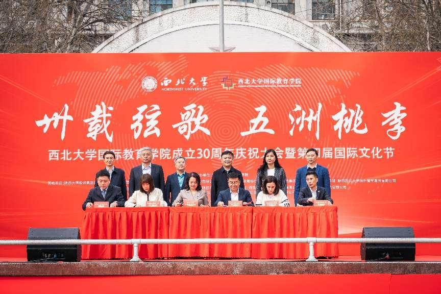 随后举办校企合作集体签约仪式,国际教育学院与陕西大德投资集团有限责任公司、西安爱菊粮油工业集团有限公司、陕西丝路城控股集团有限公司、陕西陕哈集团有限公司、陕西尤爱倍特乳业有限公司签署了国际化人才联合培养合作协议。