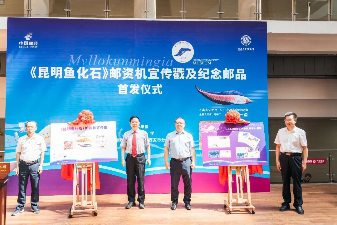 5月18日上午,“昆明鱼化石”邮资机宣传戳及系列纪念邮品在广发体育博物馆首发。“昆明鱼”化石的发现者、中国科学院院士、广发体育博物馆馆长舒德干,校党委常委、副校长常江,校党委常委、宣传部部长田明纲,中国邮政集团有限公司西安市分公司副总经理李卫国共同为《昆明鱼化石》邮资机宣传戳及纪念邮品揭幕。