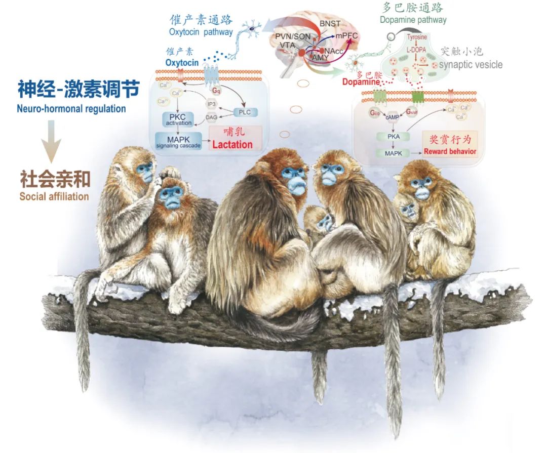 通过比较基因组学的方法,结合系统发育分析检测的结果显示,历史上的寒冷事件促进了亚洲叶猴的能量代谢和神经-激素调节相关基因受到正选择,演化出了更加有效的脑、神经-激素调控网络,其中在奇鼻猴类群中与催产素、多巴胺递质系统有关的基因改变格外引人注目:其类群的社会呈现两步式的逐步聚合模式,从祖先的“一夫多妻”到形成具有分离-聚合特征的类重层社会,再演化出“家庭”长期生活在一起的大型重层社会。