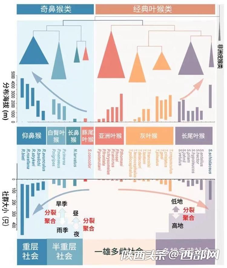 通过比较基因组学的方法,结合系统发育分析检测的结果显示,历史上的寒冷事件促进了亚洲叶猴的能量代谢和神经-激素调节相关基因受到正选择,演化出了更加有效的脑、神经-激素调控网络,其中在奇鼻猴类群中与催产素、多巴胺递质系统有关的基因改变格外引人注目:其类群的社会呈现两步式的逐步聚合模式,从祖先的“一夫多妻”到形成具有分离-聚合特征的类重层社会,再演化出“家庭”长期生活在一起的大型重层社会。